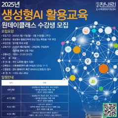 목록 25년 생성형AI 활용교육 원데이클래스 접수기간 2025-03-17 ~ 2025-03-31 모집대상 생성형AI 활용교육에 관심 있는 사업구역 내 주민 모집인원 일자별 최대 20명 교육기간 2025-04-08 ~ 2025-04-24 교육장소 소통·봄꿈센터 4층 참가신청 신청이 마감되었습니다. 프로그램 상세소개 자세한 내용은 신청링크를 통해 확인해주세요!