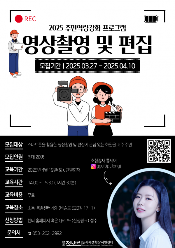 목록 영상촬영 및 편집 접수기간 2025-03-27 ~ 2025-04-10 모집대상 스마트폰을 활용한 영상촬영 및 편집에 관심 있는 화원읍 주민 누구나 모집인원 최대 20명 교육기간 2025-04-19 교육장소 소통·봄꿈센터 4층 참가신청 신청이 마감되었습니다. 프로그램 상세소개 자세한 내용은 신청링크를 통해 확인해주세요!