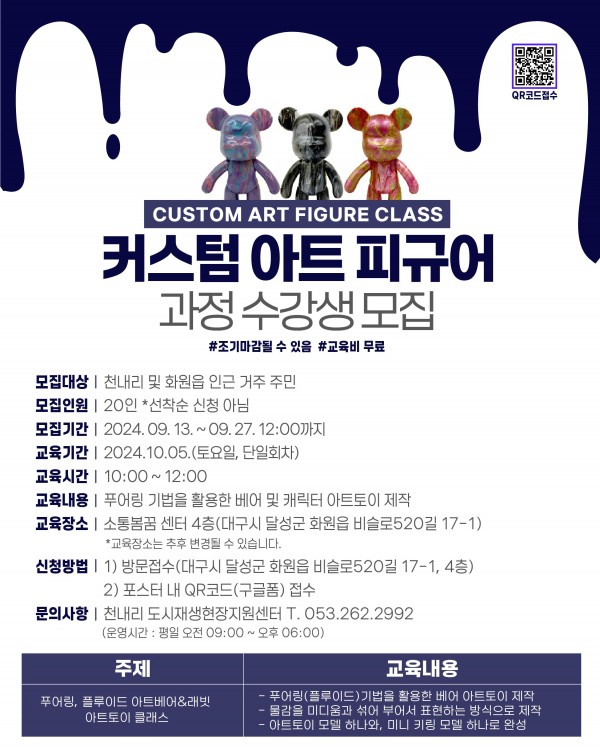 목록 24년 커스텀아트피규어 과정 수강생 모집 접수기간 2024-09-13 ~ 2024-09-27 모집대상 천내리, 화원읍 및 인근 거주 주민 모집인원 20인 *선착순 신청 아님 교육기간 2024-10-05 토요일 10:00~12:00 (단일회차) 교육장소 천내리 소통봄꿈센터 4층 참가신청 신청이 마감되었습니다. 프로그램 상세소개 자세한 사항은 포스터와 신청 구글폼을 참고해주세요