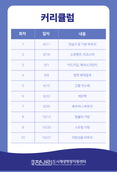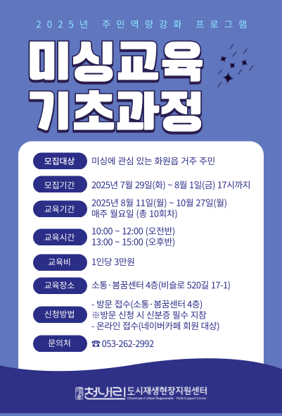 목록 미싱 마을강사활용 기초과정 접수기간 2025-07-29 ~ 2025-08-01 모집대상 미싱에 관심 있는 화원읍 거주 주민 모집인원 반별 최대 5명 교육기간 2025-08-11 ~ 2025-10-27 교육장소 소통·봄꿈센터 4층 참가신청 신청이 마감되었습니다. 프로그램 상세소개 자세한 사항은 게시글 내 웹 포스터 또는 방문 접수 시 제공되는 신청 페이지를 통해 확인해주시기 바랍니다.