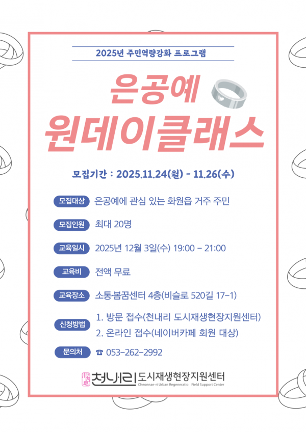 목록 2025년 은공예 원데이클래스 수강생 모집 접수기간 2025-11-24 ~ 2025-11-26 모집대상 은공예에 관심 있는 화원읍 거주 주민 모집인원 20명 교육기간 2025-12-03 교육장소 소통·봄꿈센터 4층 참가신청 신청이 마감되었습니다. 프로그램 상세소개 자세한 사항은 게시글 내 웹 포스터 또는 방문 접수 시 제공되는 신청 페이지를 통해 확인해주시기 바랍니다.