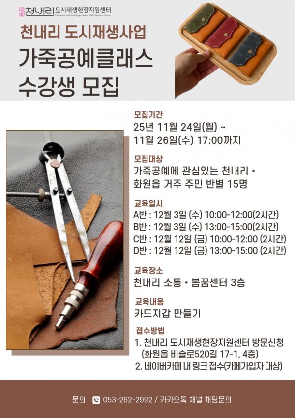 목록 2025년 가죽공예클래스 수강생 모집 접수기간 2025-11-24 ~ 2025-11-26 모집대상 가죽공예에 관심 있는 화원읍 거주 주민 모집인원 반별 최대 15명 교육기간 2025-12-03, 2025-12-12 교육장소 소통·봄꿈센터 3층 참가신청 신청이 마감되었습니다. 프로그램 상세소개 자세한 사항은 게시글 내 웹 포스터 또는 방문 접수 시 제공되는 신청 페이지를 통해 확인해주시기 바랍니다.